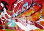 Explosief schilderij, letterlijk, zonder kwast met gooien, spuiten, spetteren, zonder palet te gebruiken.