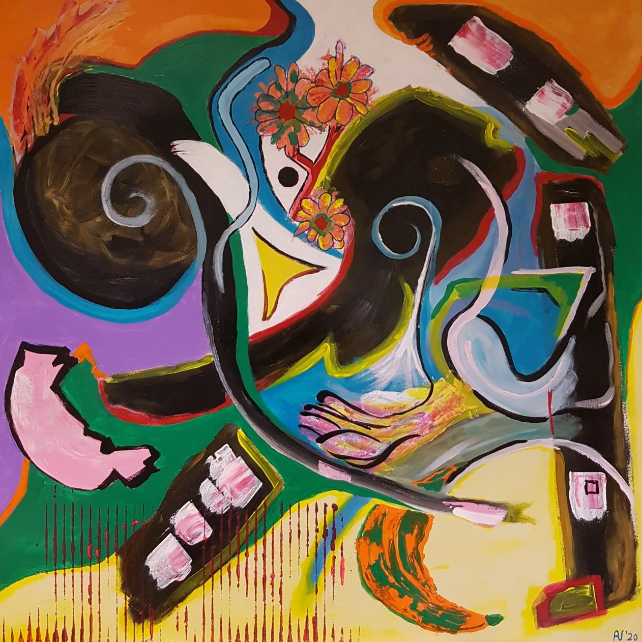 Een globale impressie van het schilderij "Onderweg" 110x110cm.
