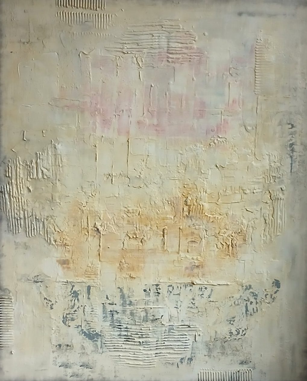 De ondergrond is rijk bewerkt, de basis licht en verder bewerkt met de lichte kleuren grijs, geel en rood, De buitenkant van het doek is met donkergrijs houtskool zodanig bewerkt dat het een wat donkerder uiterlijk heeft, te zien op de foto links onder, maar in werkelijkheid zie je dit aan alle randen om het wat diepgang te geven.